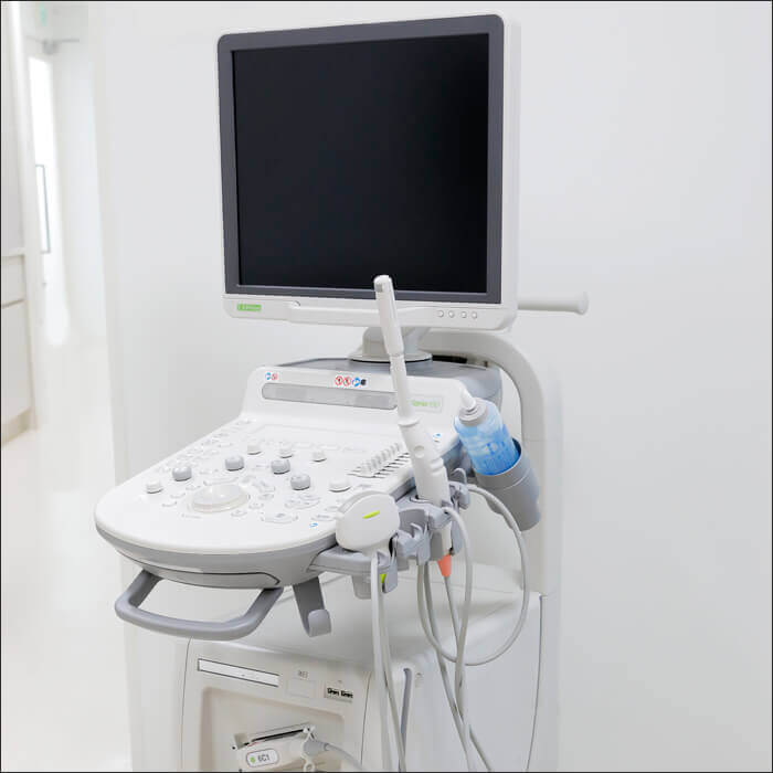 腎臓の形態、膀胱病変、さらに男性では前立腺肥大の有無をみるために必須の検査です。侵襲もなく、腎では腎実質の胞性変化、良性あるいは悪性腫瘍、腎結石の発見、さらに尿路の閉塞に伴う水腎症、膀胱結石や残尿量、膀胱腫瘍の発見に有効です。